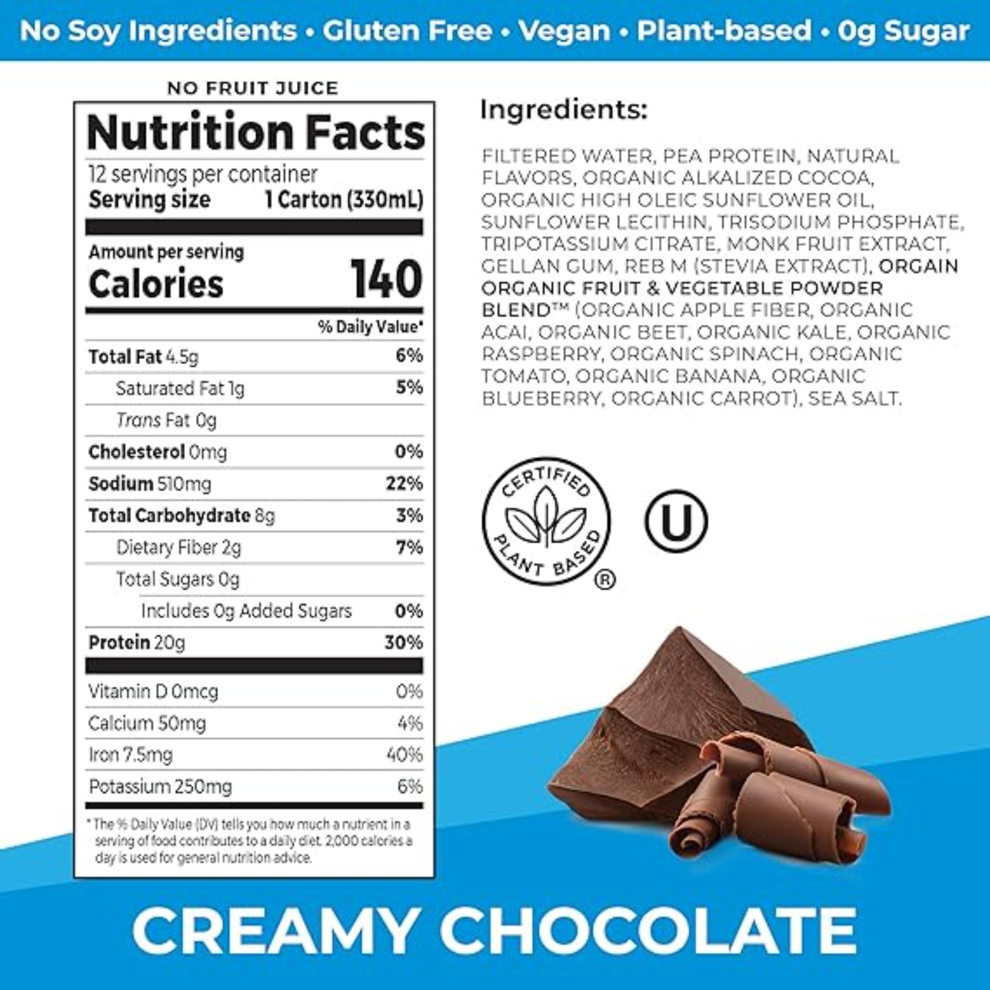 Have you been searching for a plant-based protein shake that serves up nothing but delicious taste while staying fueled for whatever the day brings your way? Behold, Orgain’s 20g Plant-Based Protein Shake. Expertly crafted, all our high-quality ingredients have been hand-selected for maximum nutrition and taste. What does that mean? It means we searched high and low, far and wide, to bring you our very best, with each ingredient having to meet our higher standards. These nutrition powerhouses were no exception and were designed to make plant-protein as smooth, creamy, and grit-free as possible. Each serving has 20 grams of protein and is certified protein. Not to mention, these are gluten-free, have no soy ingredients, or artificial colors, flavors, sweeteners, or preservatives. At 140 calories and zero grams of sugar* per serving, they're a no brainer when it comes to making these a delicious part of your routine. Whether you’re a busy professional, parent, athlete, or anyone in need of a deliciously wholesome creamy chocolate snack, we made this to help you taken on whatever life decides to throw at you. Good, clean nutrition ready for you to take it on the go, whenever and wherever you need it. *not a low calorie food